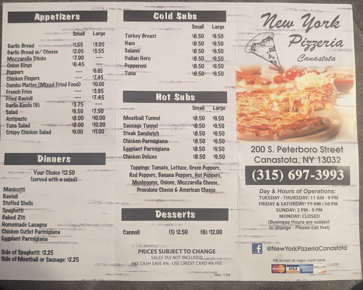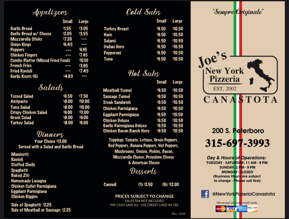 Welcome to Joe’s New York Pizzeria, a beloved gem located at 200 S Peterboro St in Canastota, NY. This family-owned establishment specializes in delectable pizzas that transport you straight to the heart of New York. With a diverse menu featuring items like the Rustica Pizza and El Diablo, pizza enthusiasts can find a favorite with ease.